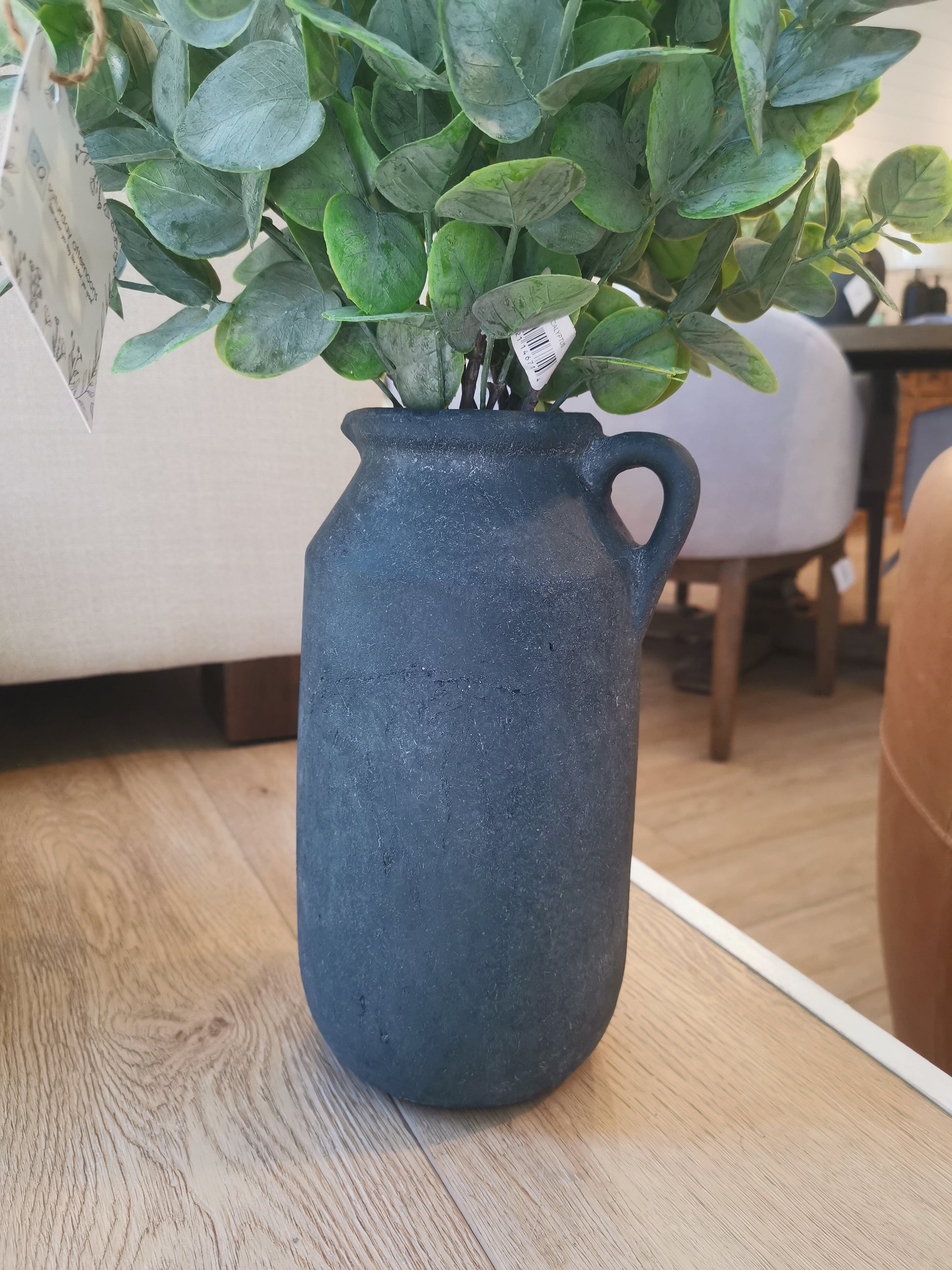 With its deep blue-black tones and textured, stone-like finish, this vase adds moody elegance and sculptural interest to any space. Its organic form and matte surface give it the look of hand-carved stone, perfect for pairing with dried florals or displaying on its own as a striking decor piece.