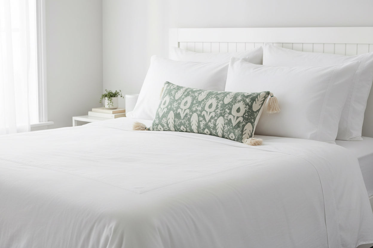 Beautiful rectangular cushion cover with floral pattern and tassels at the corners. Classic Home, French and Floral style.- green and white colours- cotton material