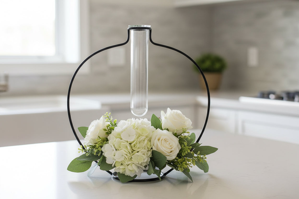 Make a striking design statement with this minimalist Wide Frame with a narrow glass vase. Crafted out of metal, the frame is a stylish complement to any type of contemporary decor, while the narrow vase allows display of fresh flowers. 12"Tall