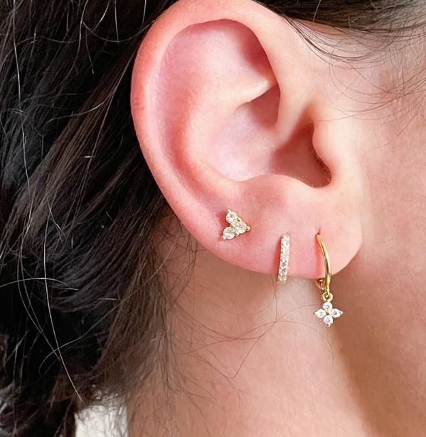 This sterling silver hoop and stud set is a beautiful trio to elevate any jewelry collection. It features 9 mm four-leaf-clover huggie hoops, 7 mm hoops set with six flush-mounted CZ stones, and charming three-leaf-clover studs measuring 6 x 6 mm. Each pair offers its own subtle sparkle and personality, and you can choose between an 18k gold vermeil or rhodium-plated finish for the look you love. Perfect for mixing, matching, and creating your own curated ear style.