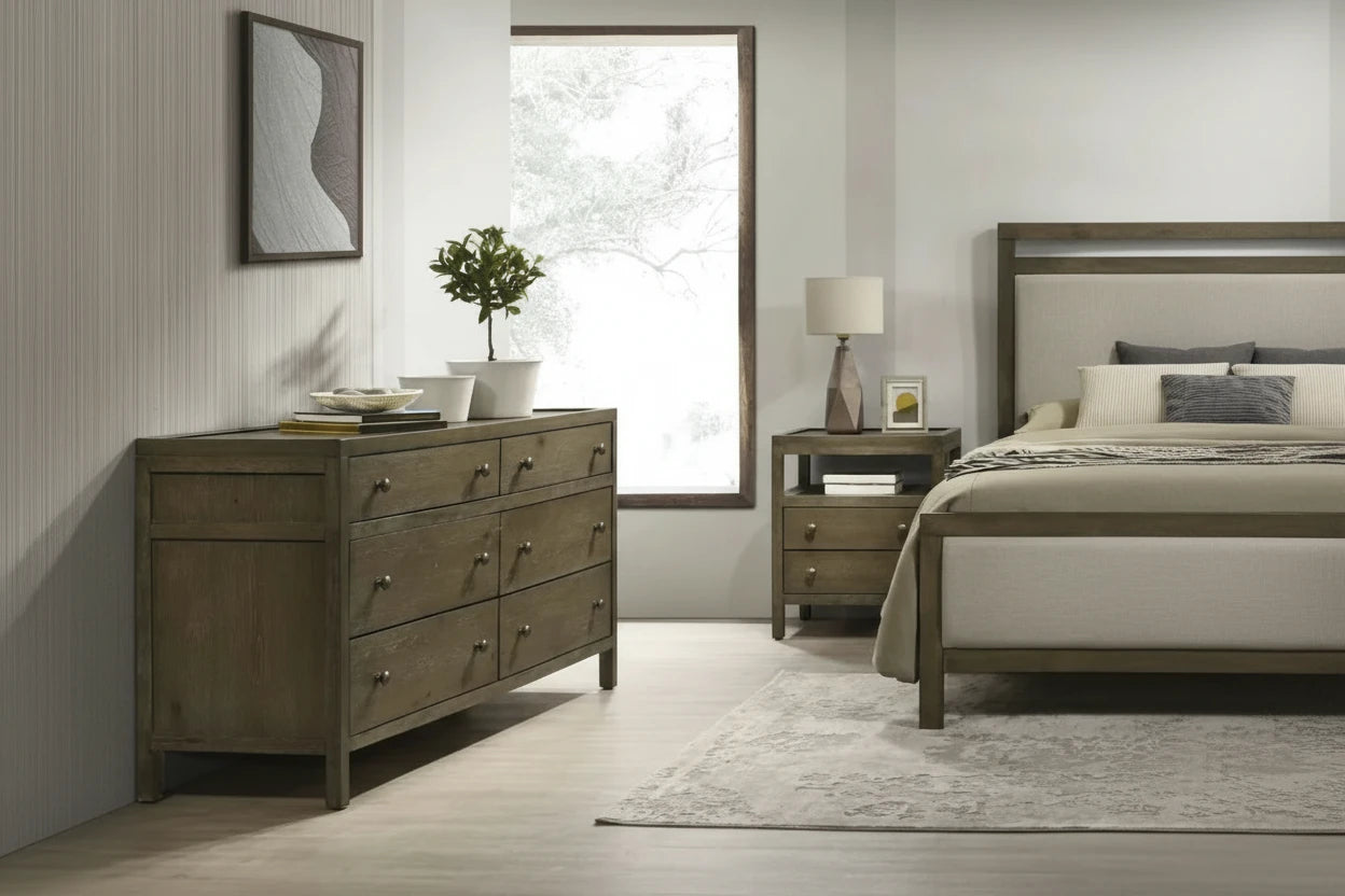 The Winston Dresser in vintage walnut blends contemporary design with a timeless, mid-century-inspired feel. Crafted with an ash veneer on durable MDF, it features solid rubberwood legs and posts for lasting stability. The rich walnut finish highlights the natural wood grain, adding warmth and sophistication to any bedroom.